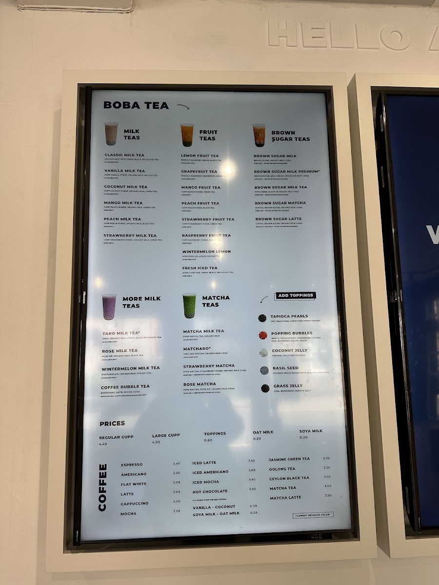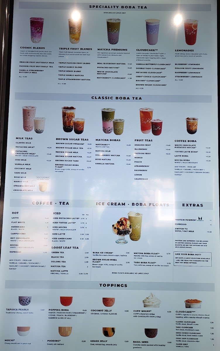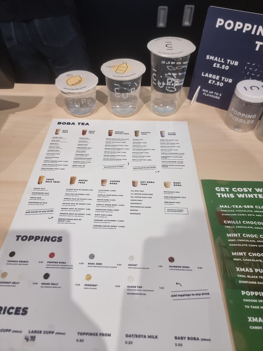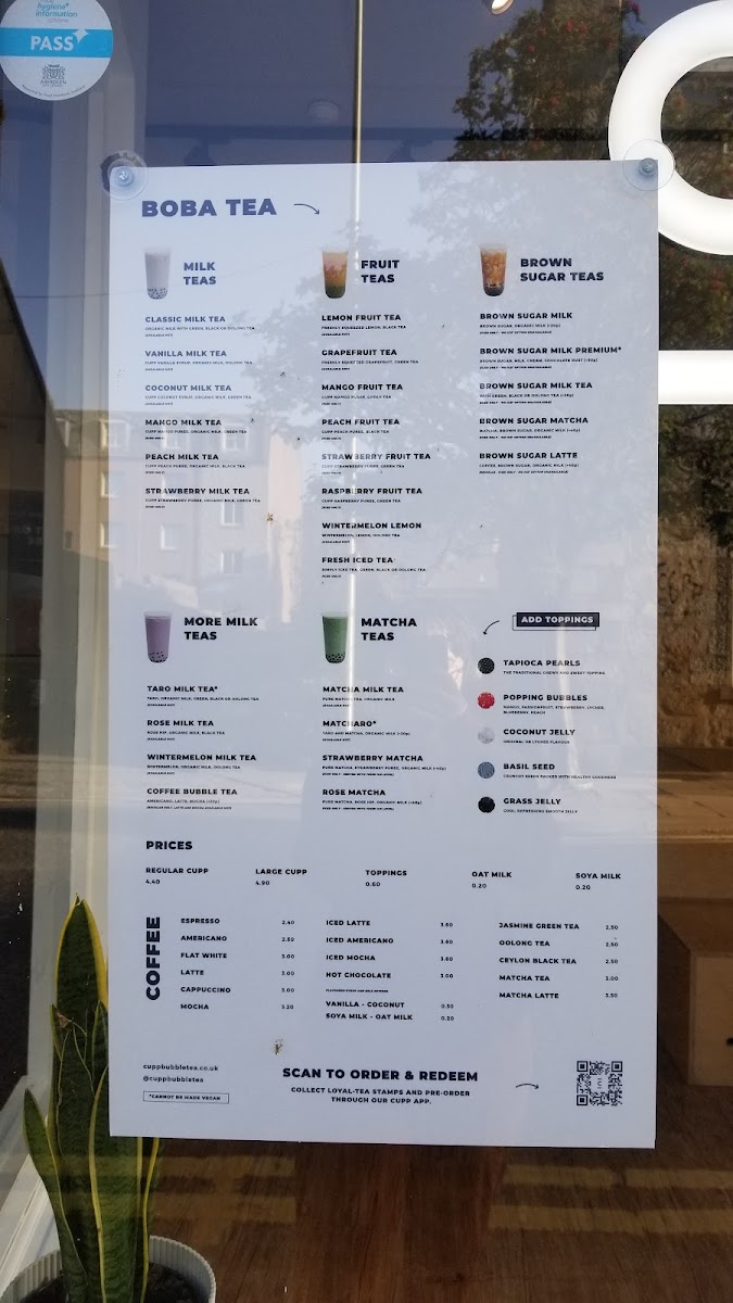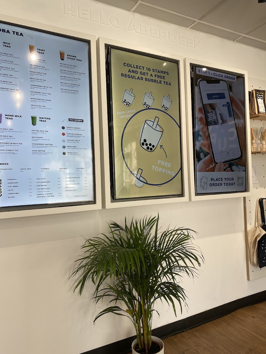 Cupp Bubble Tea in Aberdeen offers an extensive and delightful menu perfect for tea lovers with a range of flavors to choose from. Their Special Offers include familiar favorites like Classic Milk Tea, Vanilla Milk Tea, and Coconut Milk Tea, offering a sweet and comforting experience. For those who love a chewy twist, the Mochi Series features options like Classic Milk Tea W/Mochi, Taro Milk W/Mochi, and Mango Fruit W/Mochi, each combining a smooth tea base with soft, chewy mochi. The innovative Cloud Series presents refreshing options such as Mango Tea Cloud and Green Tea Cloud, alongside indulgent treats like Chocolate Cloud and Matcha Cloudcake. If you're craving something rich and flavorful, the Brown Sugar Series is a must-try, with options like Brown Sugar Taro and Brown Sugar Mocha, which offer a perfect blend of creamy sweetness and depth. For those who prefer classic drinks, the Milk Teas include crowd-pleasers like Chocolate Milk and Taro-Coconut Milk Tea, while fruit enthusiasts can enjoy a variety of Fruit Teas like Passion Fruit Tea and Mango Fruit Tea. Their Fruit Milk Teas like Peach Milk Tea and Wintermelon Milk Tea provide a creamy, fruity alternative. The Matcha Teas are perfect for matcha aficionados, with options like Mango Matcha and Matcha Milk Tea. For a fun, smaller-sized treat, the Baby Boba options like Mini Strawberry Milk and Mini Mango Milk are a sweet indulgence. If you're in the mood for something beyond tea, the Coffee Bubble Tea options like Caramel Latte Boba and Black Americano Bubble Tea offer a delicious twist on traditional coffee drinks. To complement your tea, there are also tasty Snacks available, including Tapioca Crisps - Sea Salted and H!P Smooth & Creamy Oat M!Lk Chocolate Bar. With such a diverse menu, Cupp Bubble Tea offers something for every palate.